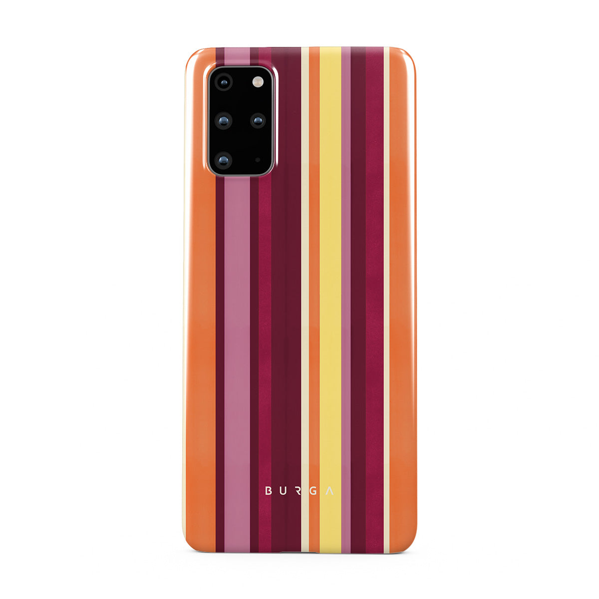 此設計特色: 橙色與紫色條紋、熱情果顏色、熱帶圖案