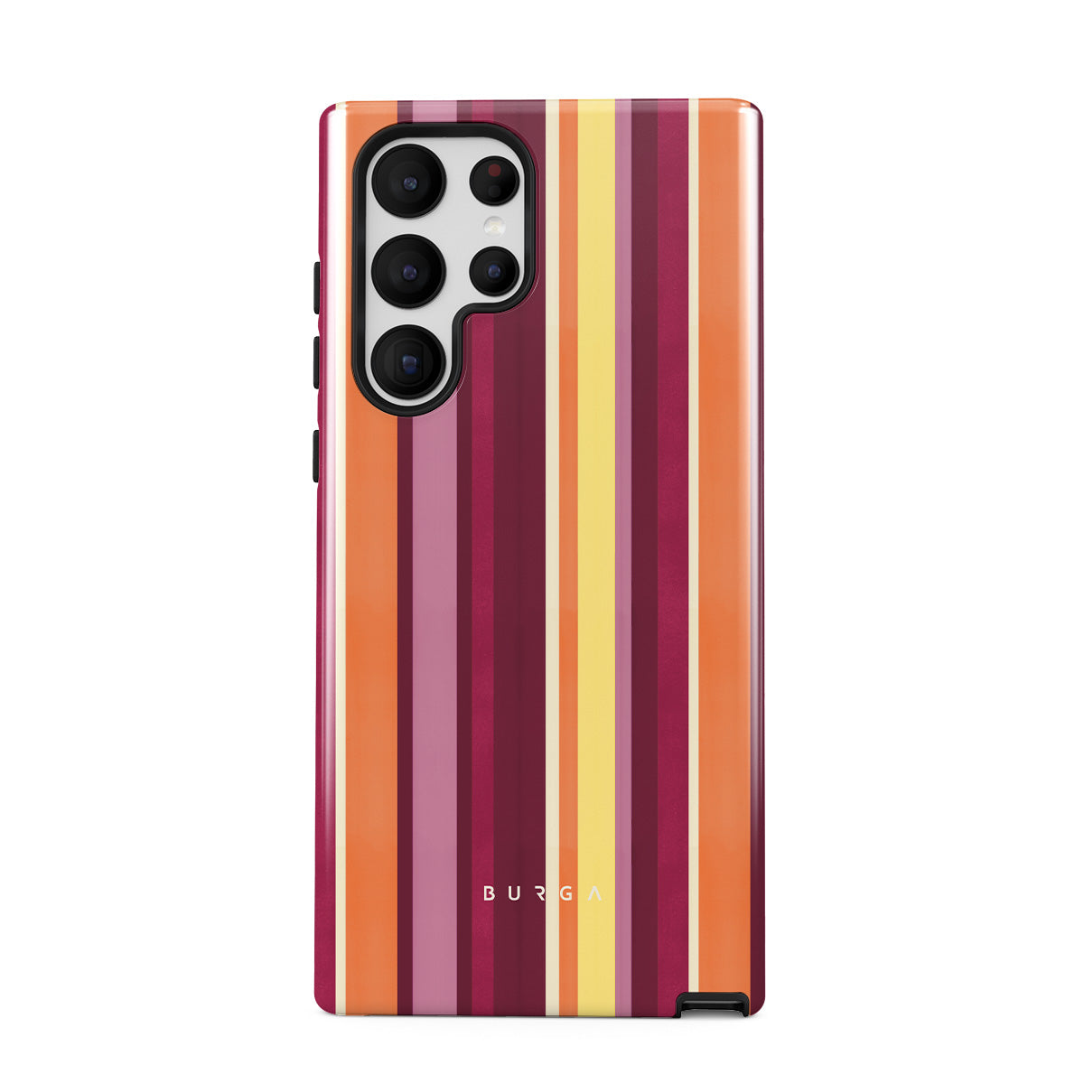此設計特色: 橙色與紫色條紋、熱情果顏色、熱帶圖案