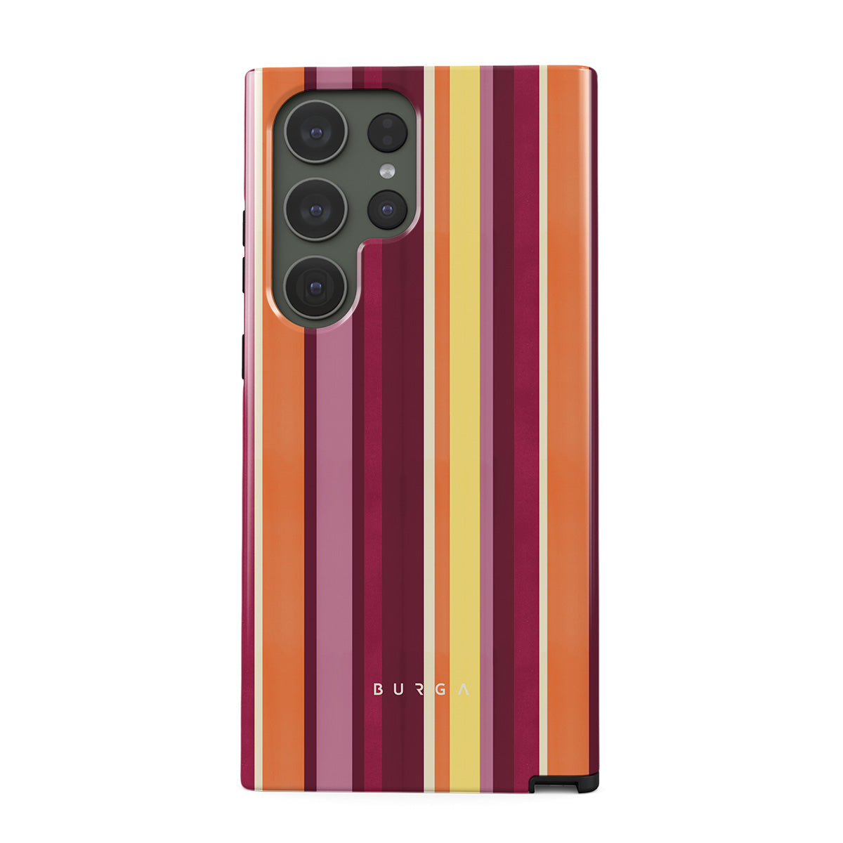 此設計特色: 橙色與紫色條紋、熱情果顏色、熱帶圖案