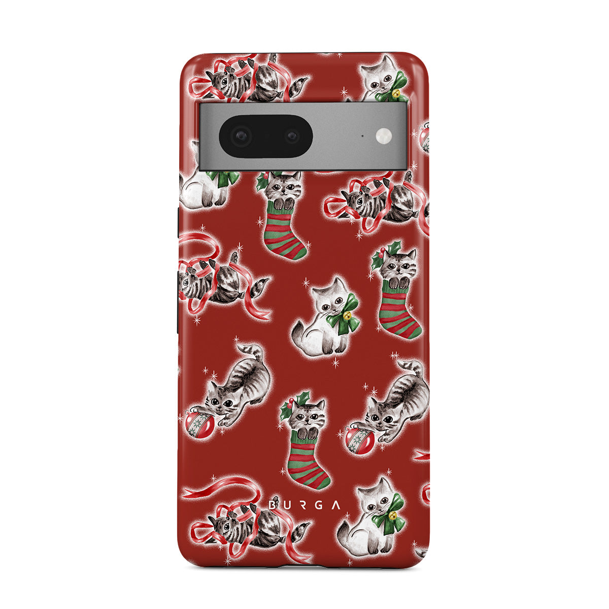 此設計特色:貓咪,聖誕襪,小貓,紅綠圖案,活潑的貓咪,聖誕裝飾品