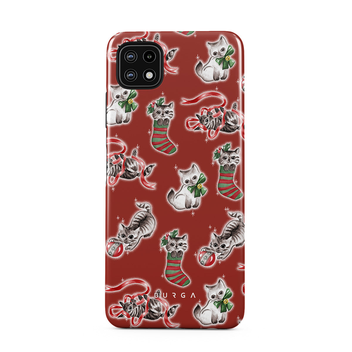 此設計特色:貓咪,聖誕襪,小貓,紅綠圖案,活潑的貓咪,聖誕裝飾品