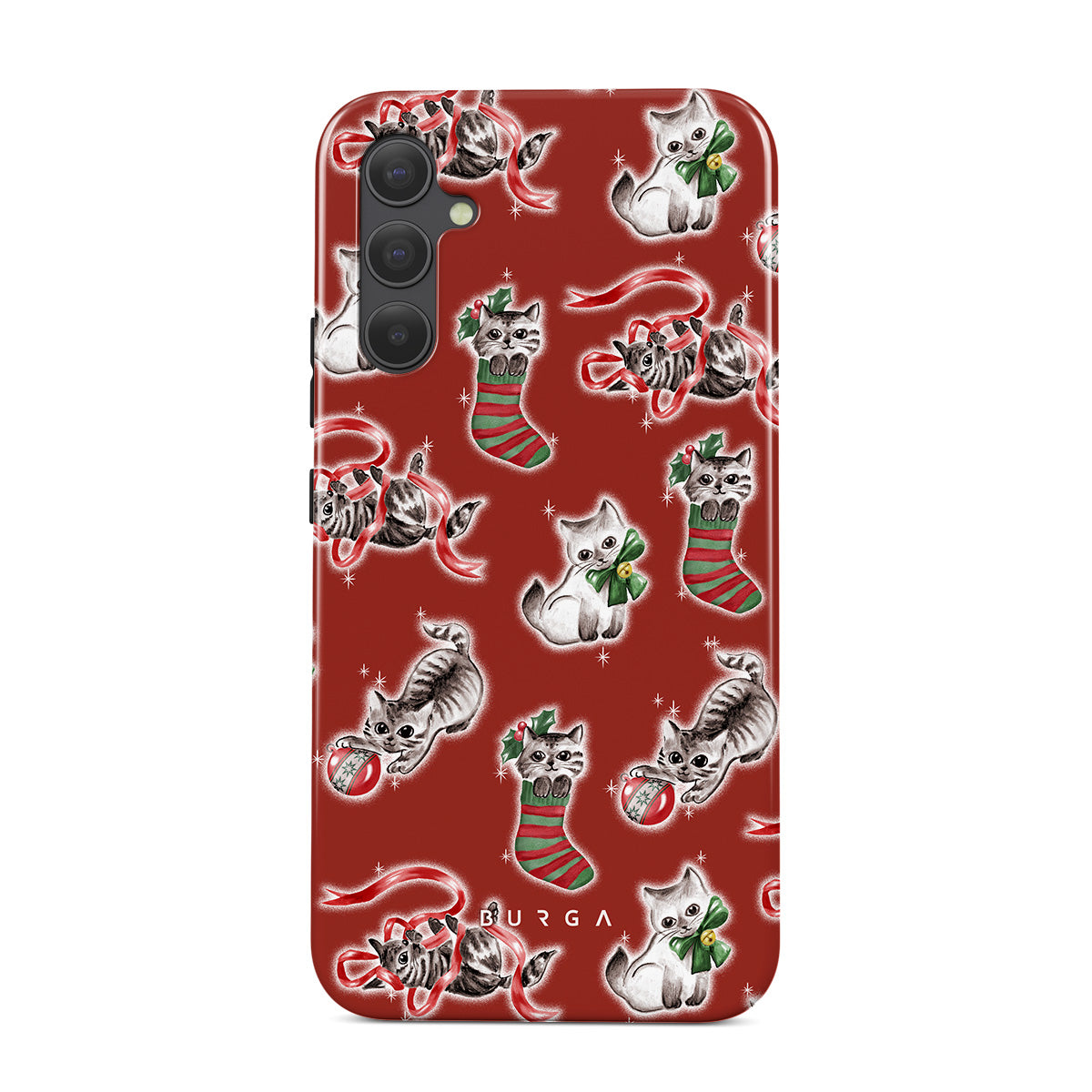 此設計特色:貓咪,聖誕襪,小貓,紅綠圖案,活潑的貓咪,聖誕裝飾品