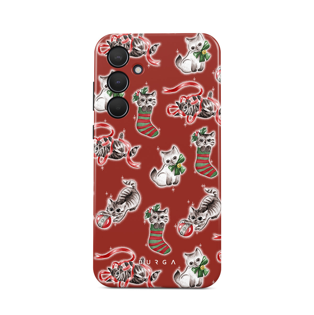 此設計特色:貓咪,聖誕襪,小貓,紅綠圖案,活潑的貓咪,聖誕裝飾品