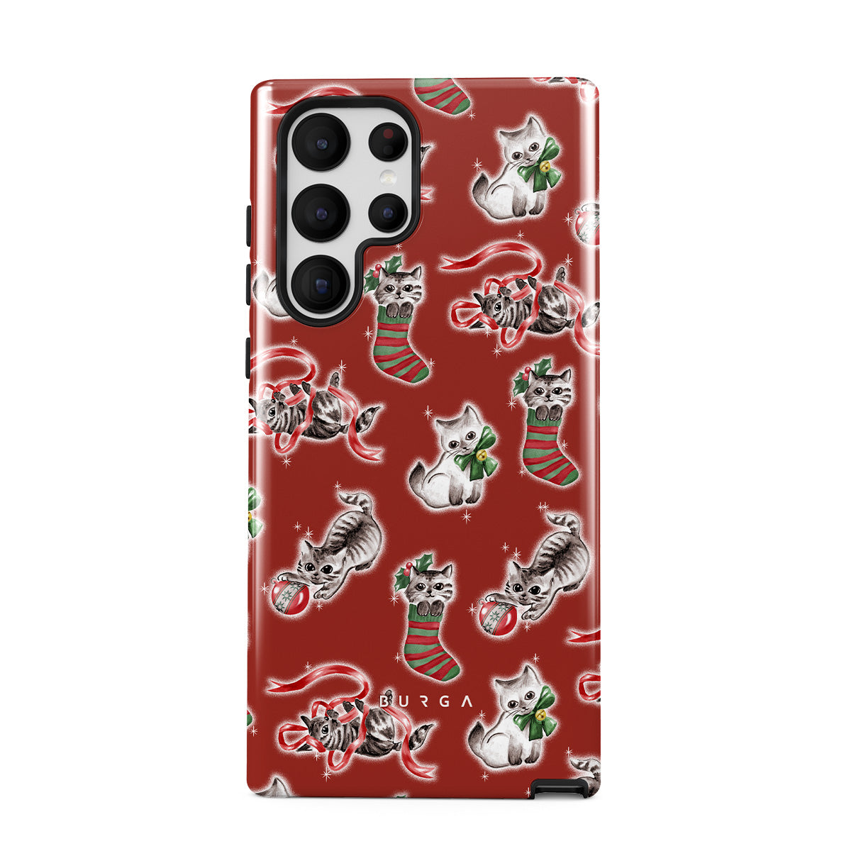 此設計特色:貓咪,聖誕襪,小貓,紅綠圖案,活潑的貓咪,聖誕裝飾品