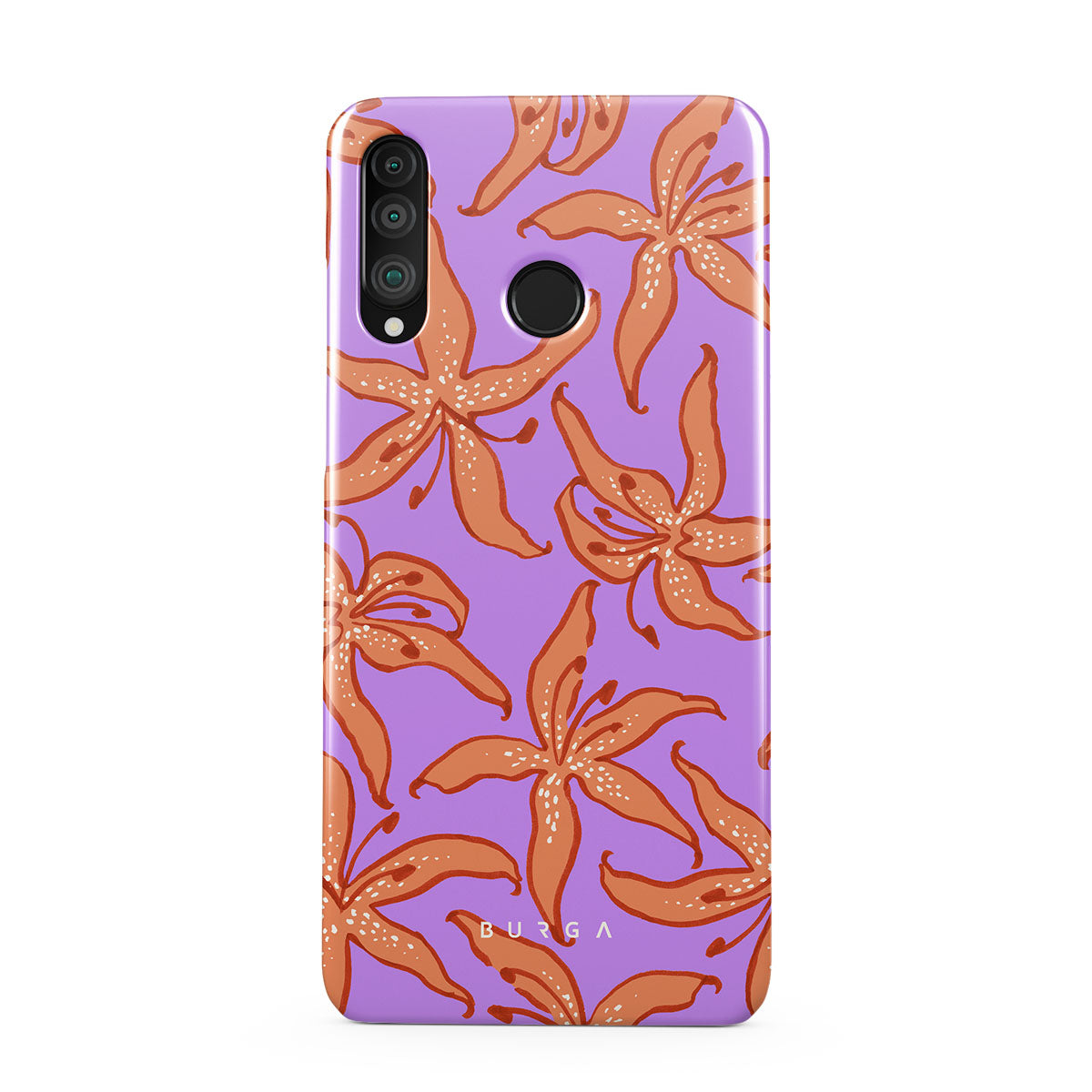 此設計特色:橙色百合,紫色背景