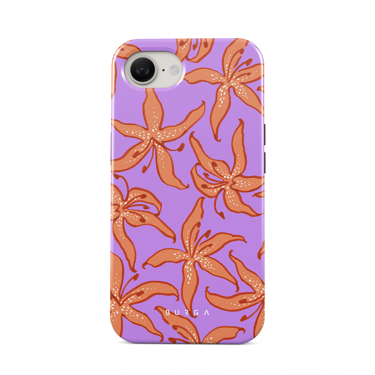 此設計特色:橙色百合,紫色背景