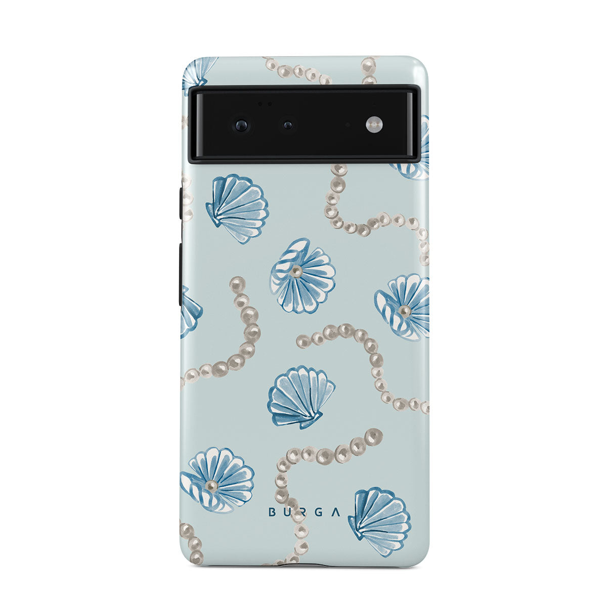 此設計特色:珍珠,海螺,淺藍色背景,海洋元素