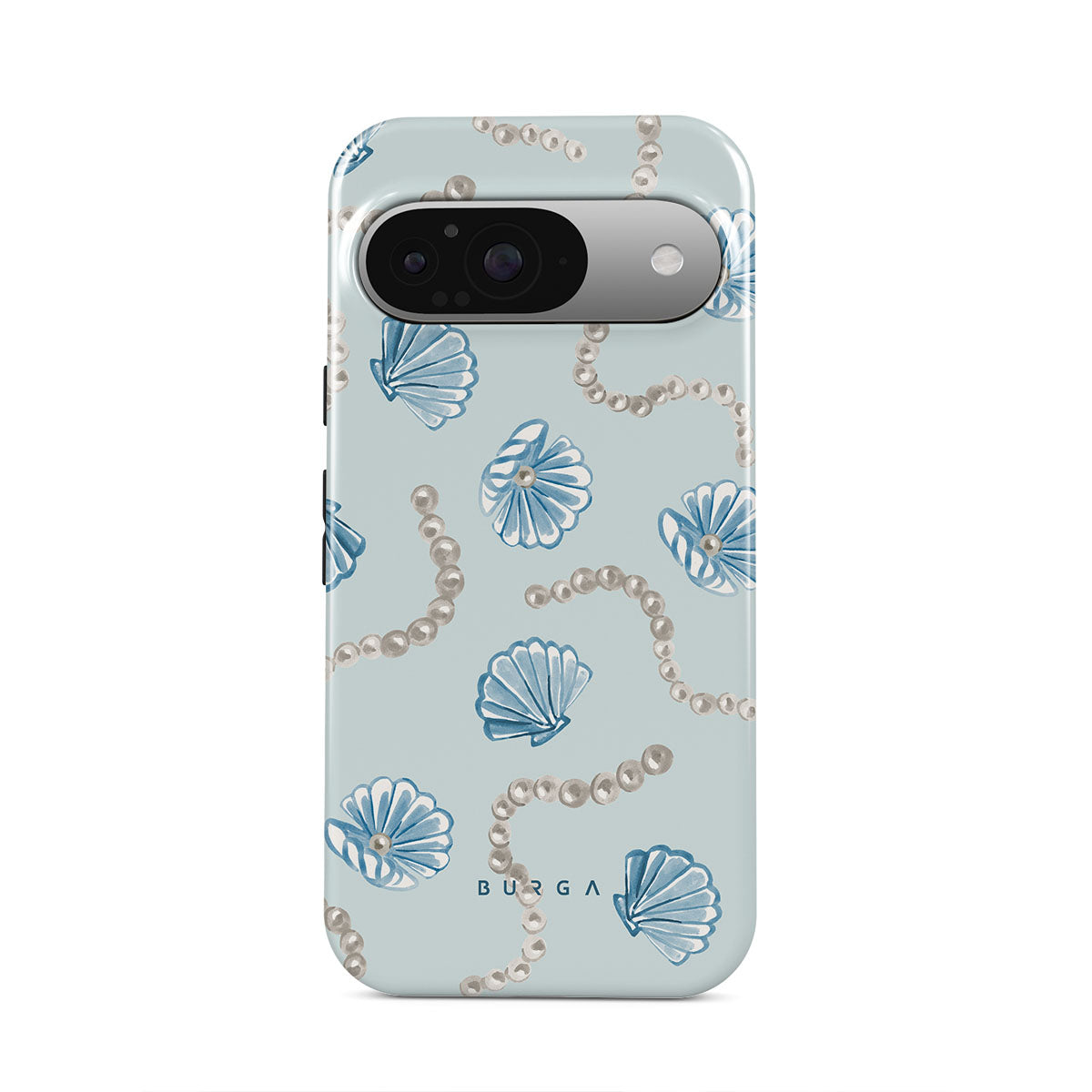 此設計特色:珍珠,海螺,淺藍色背景,海洋元素