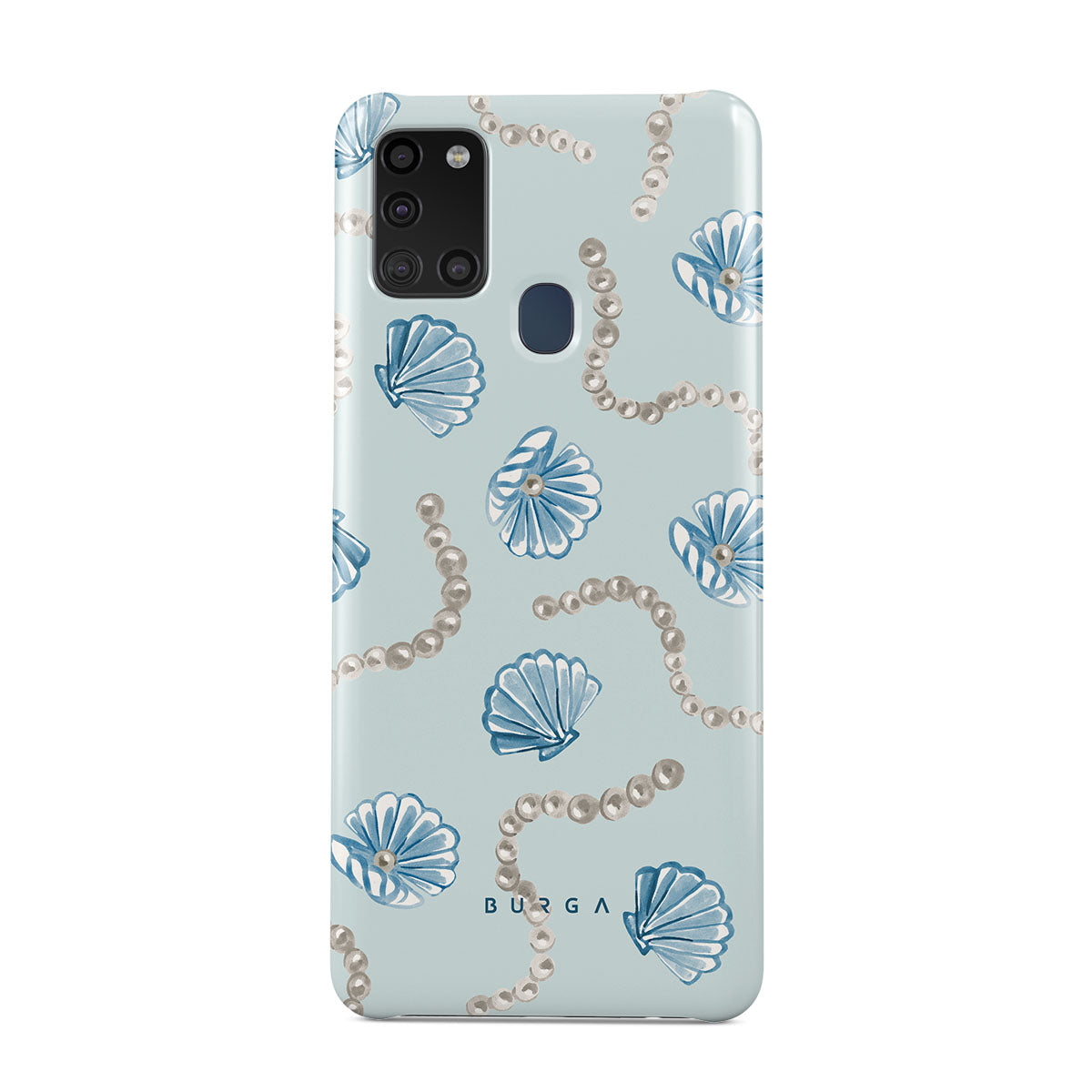 此設計特色:珍珠,海螺,淺藍色背景,海洋元素