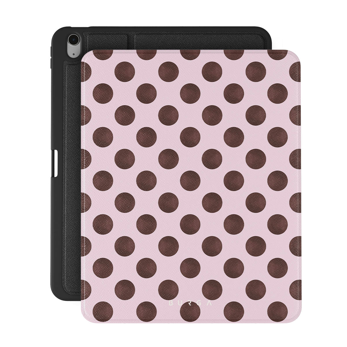 此設計特色: 復古波點圖案,粉紅色背景配上棕色圓點。