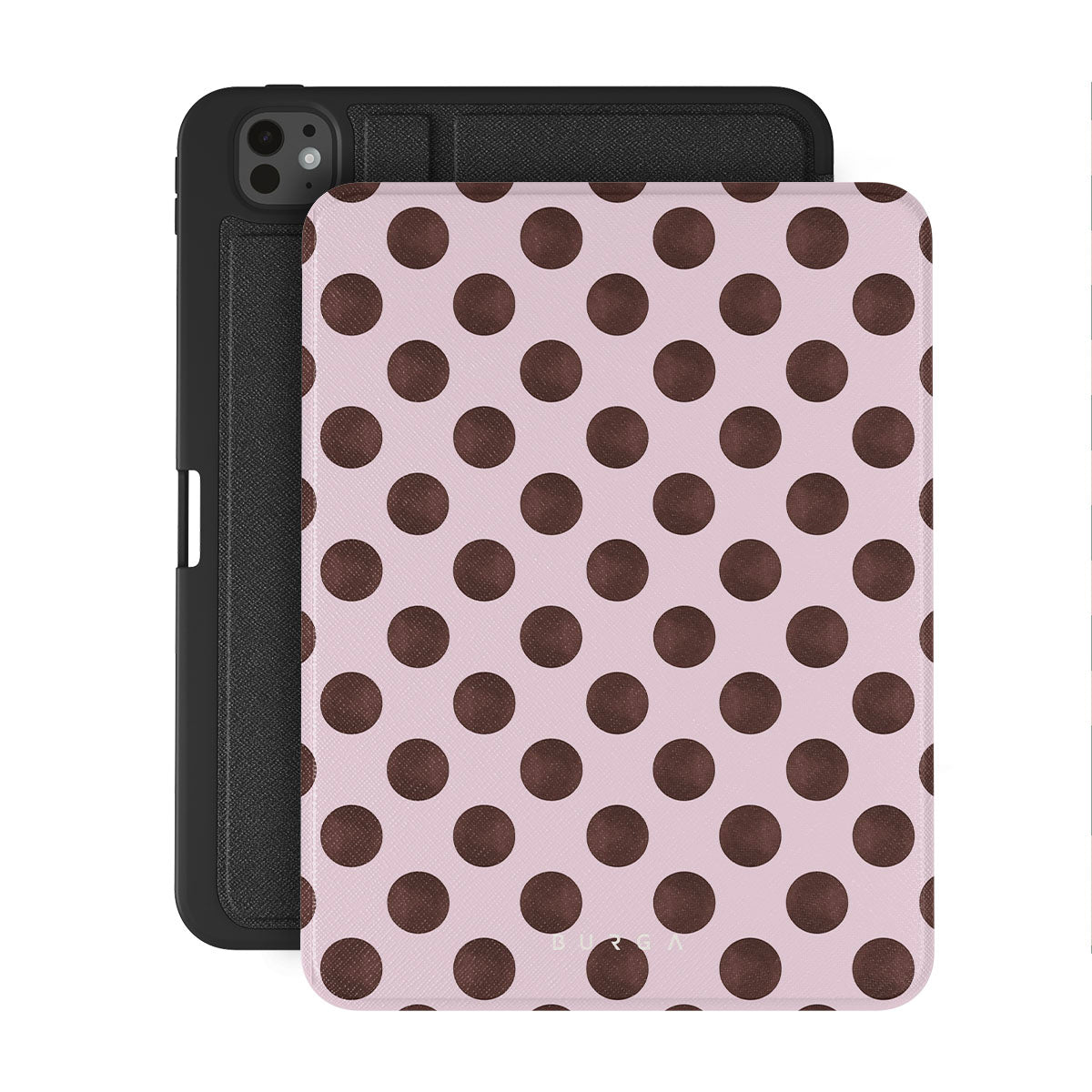 此設計特色: 復古波點圖案,粉紅色背景配上棕色圓點。