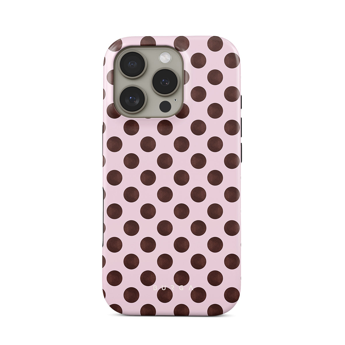 此設計特色: 復古波點圖案,粉紅色背景配上棕色圓點。