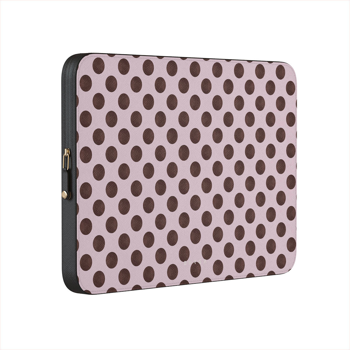 此設計特色: 復古波點圖案,粉紅色背景配上棕色圓點。