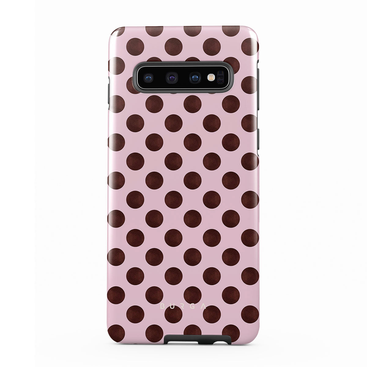 此設計特色: 復古波點圖案,粉紅色背景配上棕色圓點。