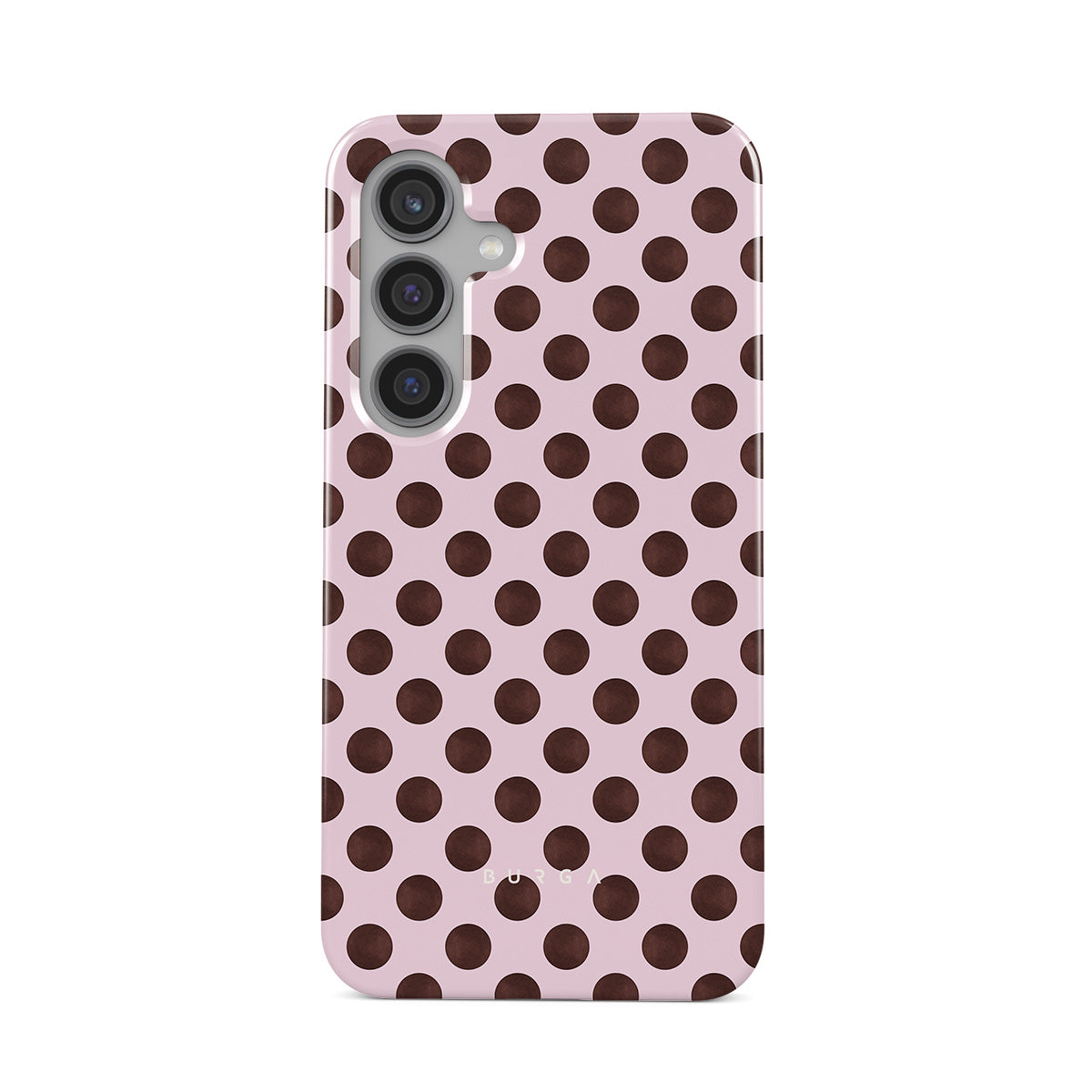 此設計特色: 復古波點圖案,粉紅色背景配上棕色圓點。