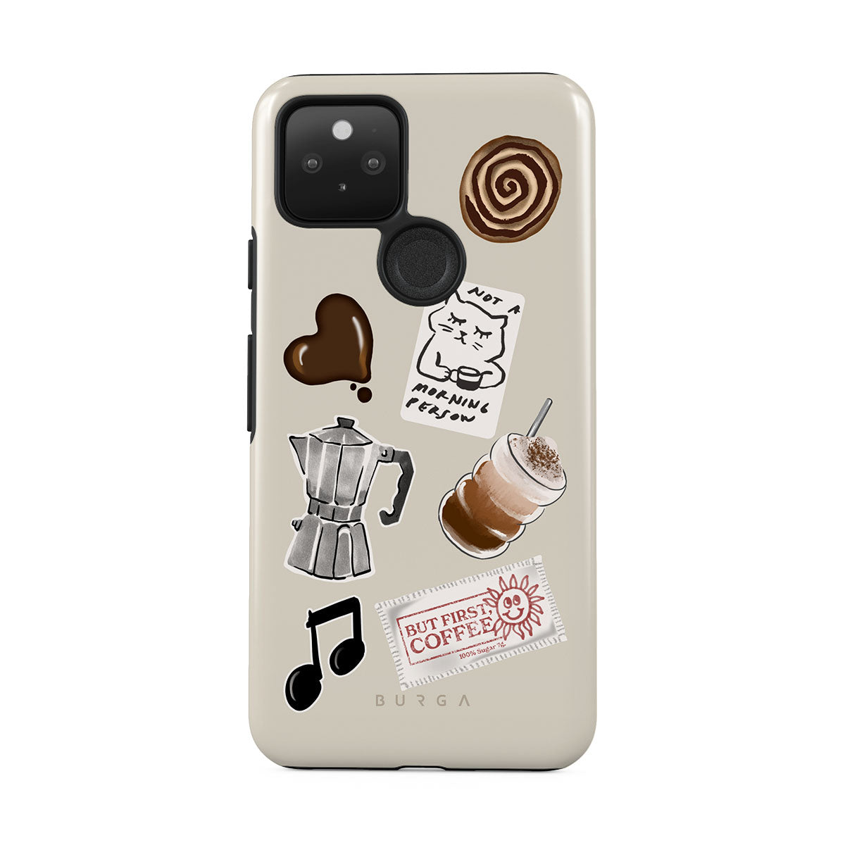 此設計特色:摩卡壺、冰沙、「不是晨型人」貼紙、「但首先,咖啡」收據、音符