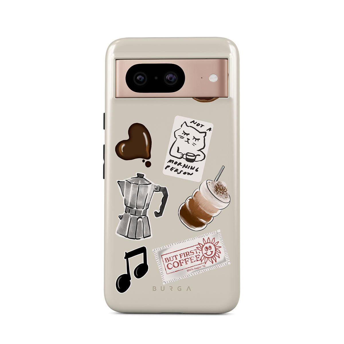此設計特色:摩卡壺、冰沙、「不是晨型人」貼紙、「但首先,咖啡」收據、音符