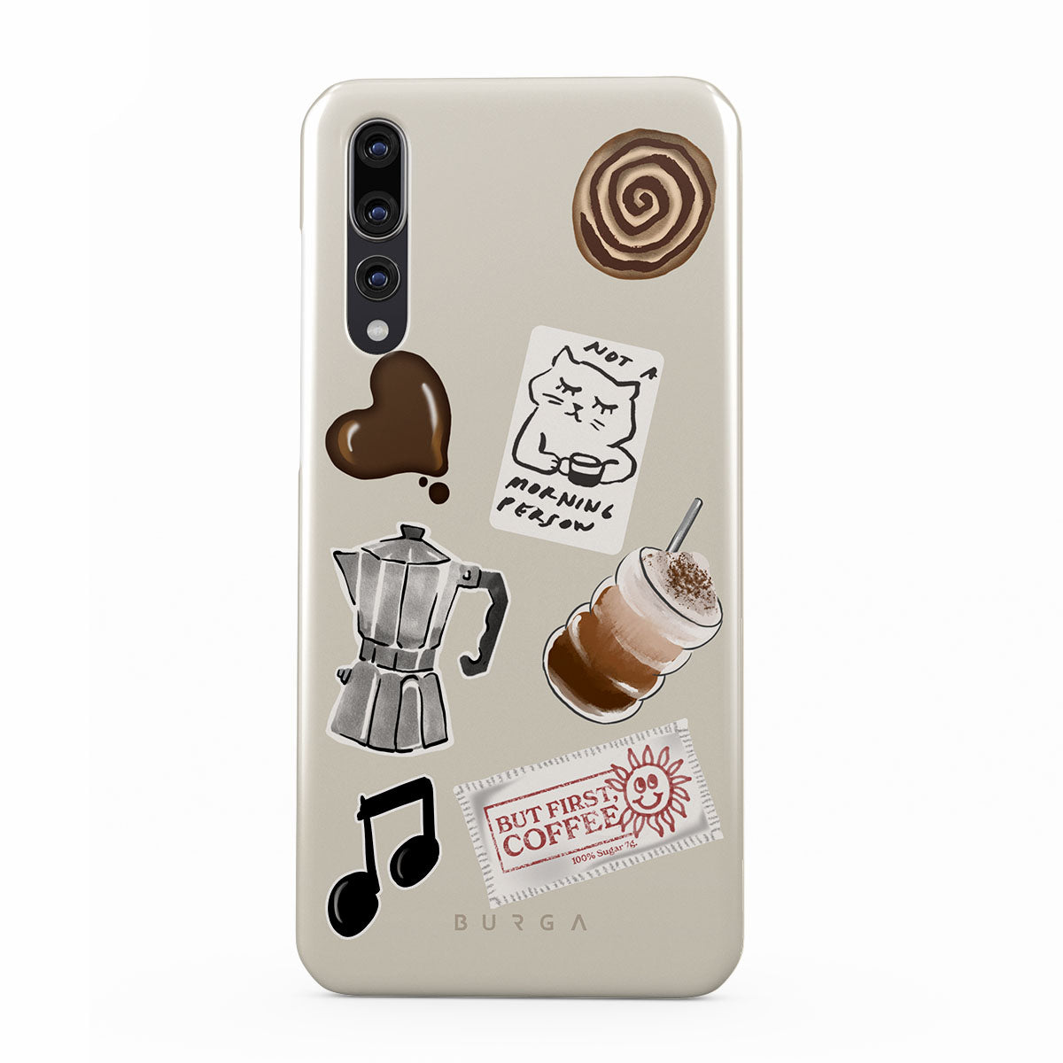 此設計特色:摩卡壺、冰沙、「不是晨型人」貼紙、「但首先,咖啡」收據、音符