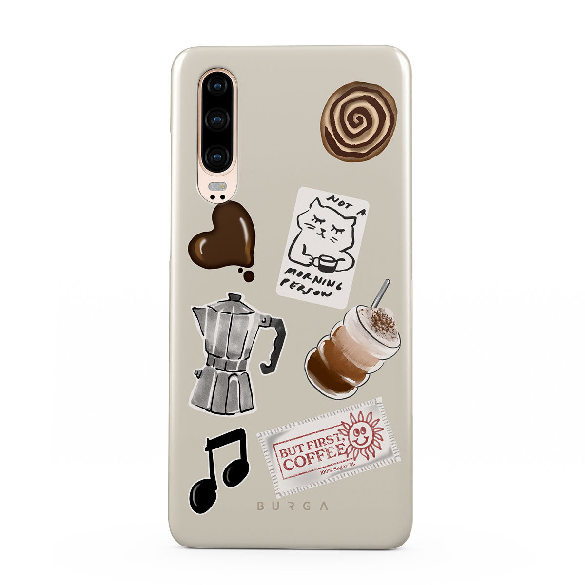 此設計特色:摩卡壺、冰沙、「不是晨型人」貼紙、「但首先,咖啡」收據、音符