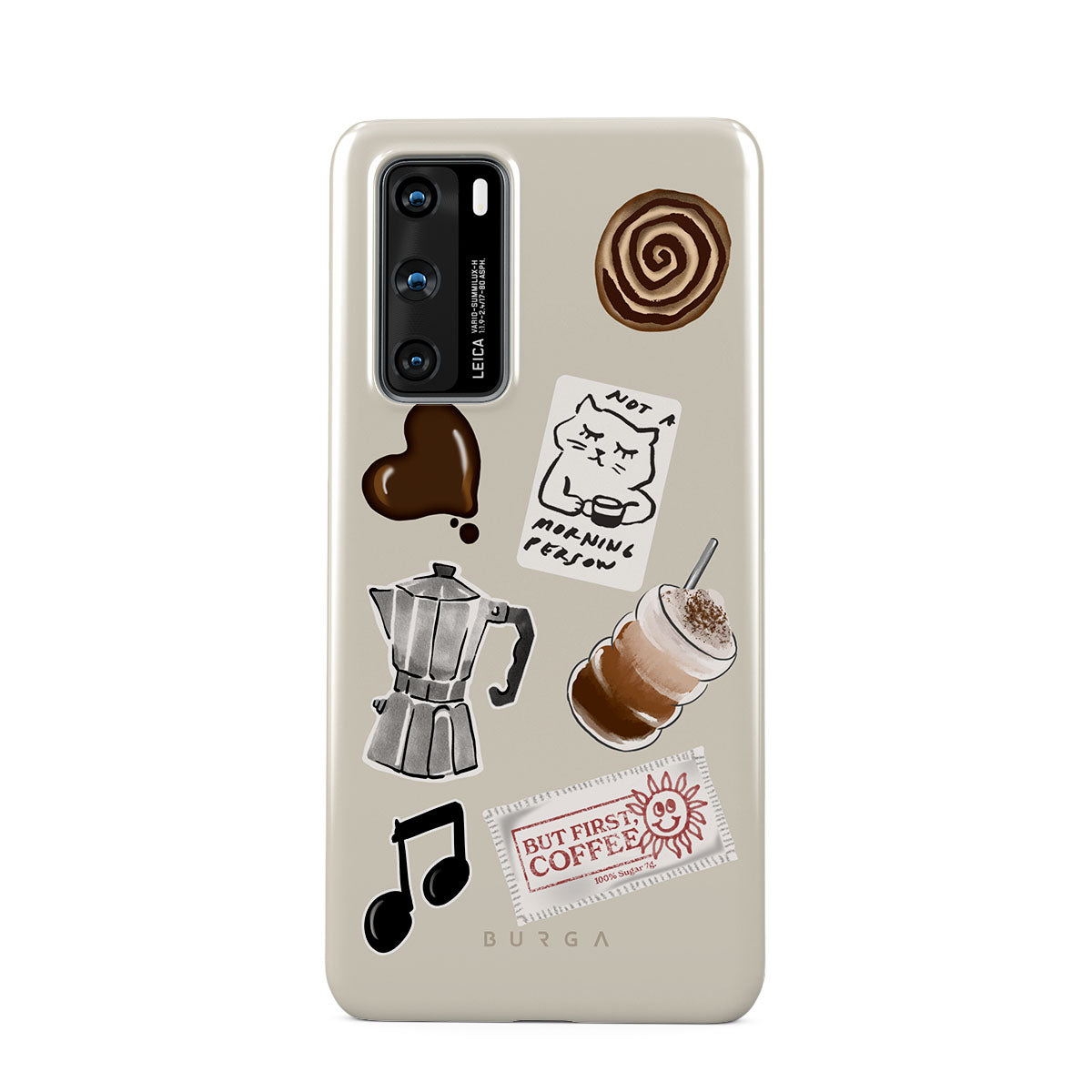 此設計特色:摩卡壺、冰沙、「不是晨型人」貼紙、「但首先,咖啡」收據、音符