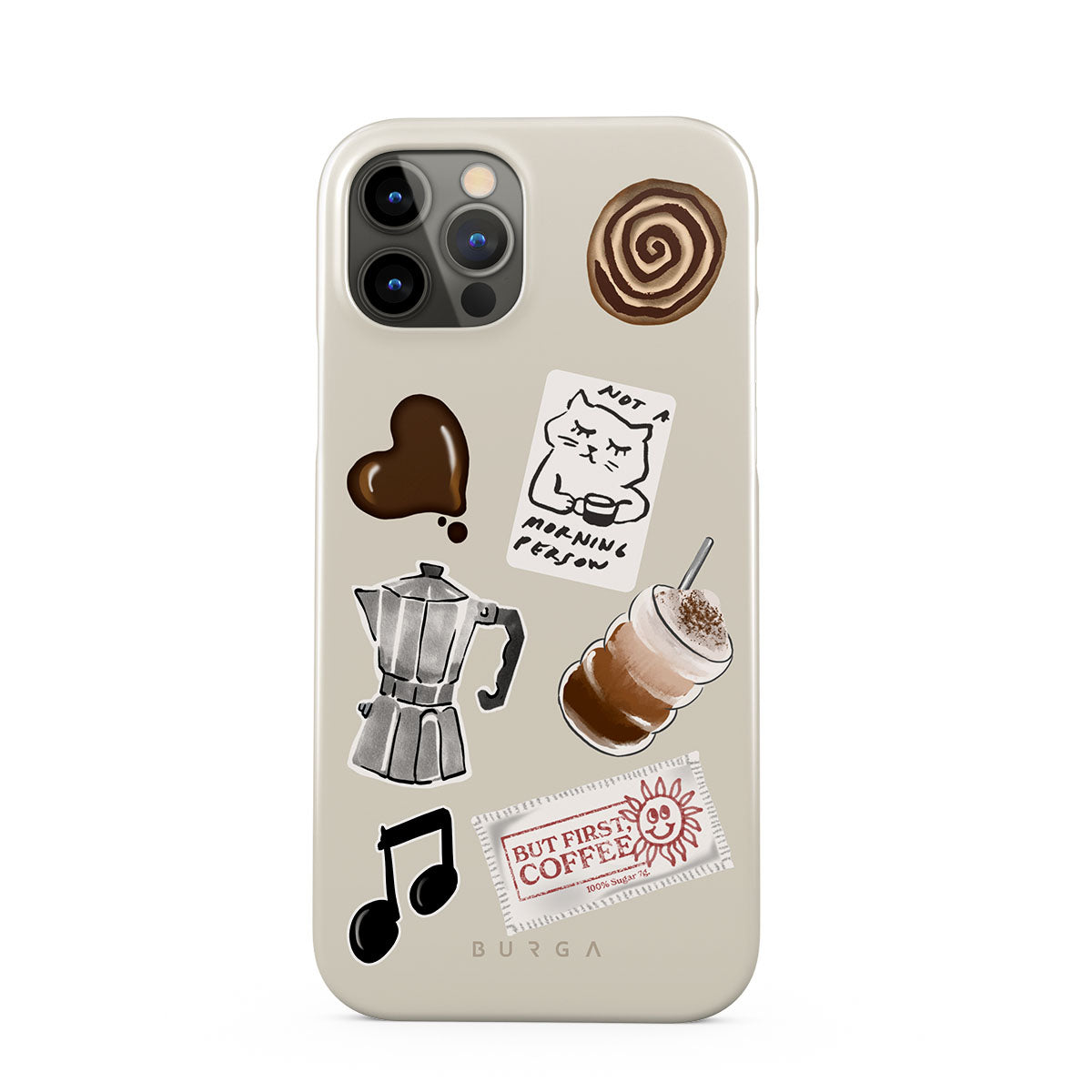 此設計特色:摩卡壺、冰沙、「不是晨型人」貼紙、「但首先,咖啡」收據、音符