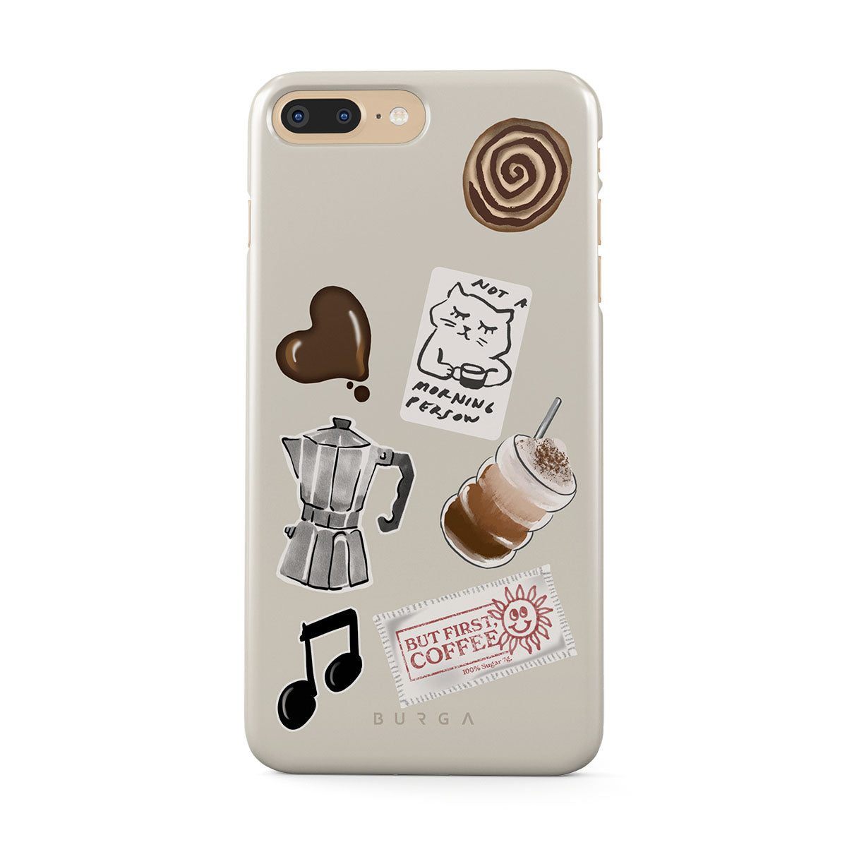 此設計特色:摩卡壺、冰沙、「不是晨型人」貼紙、「但首先,咖啡」收據、音符