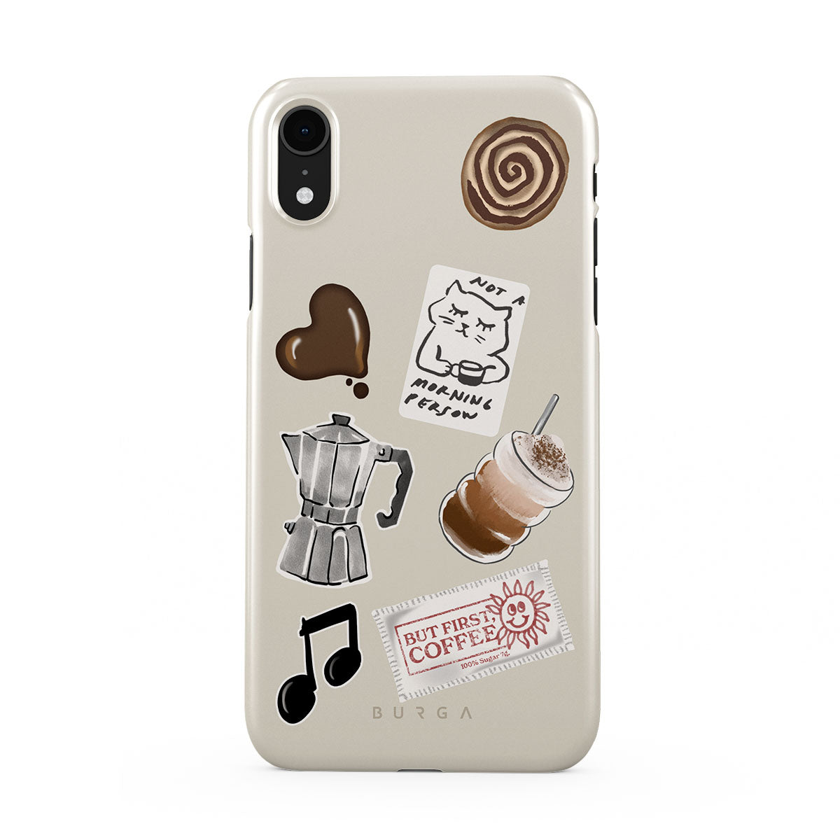 此設計特色:摩卡壺、冰沙、「不是晨型人」貼紙、「但首先,咖啡」收據、音符