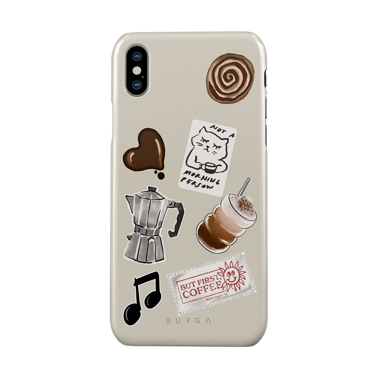 此設計特色:摩卡壺、冰沙、「不是晨型人」貼紙、「但首先,咖啡」收據、音符