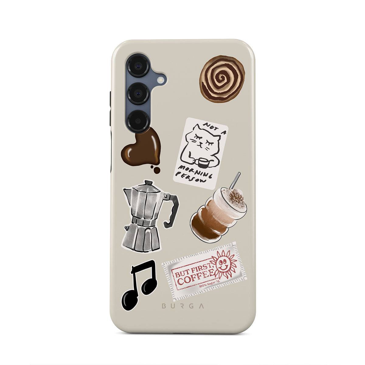 此設計特色:摩卡壺、冰沙、「不是晨型人」貼紙、「但首先,咖啡」收據、音符