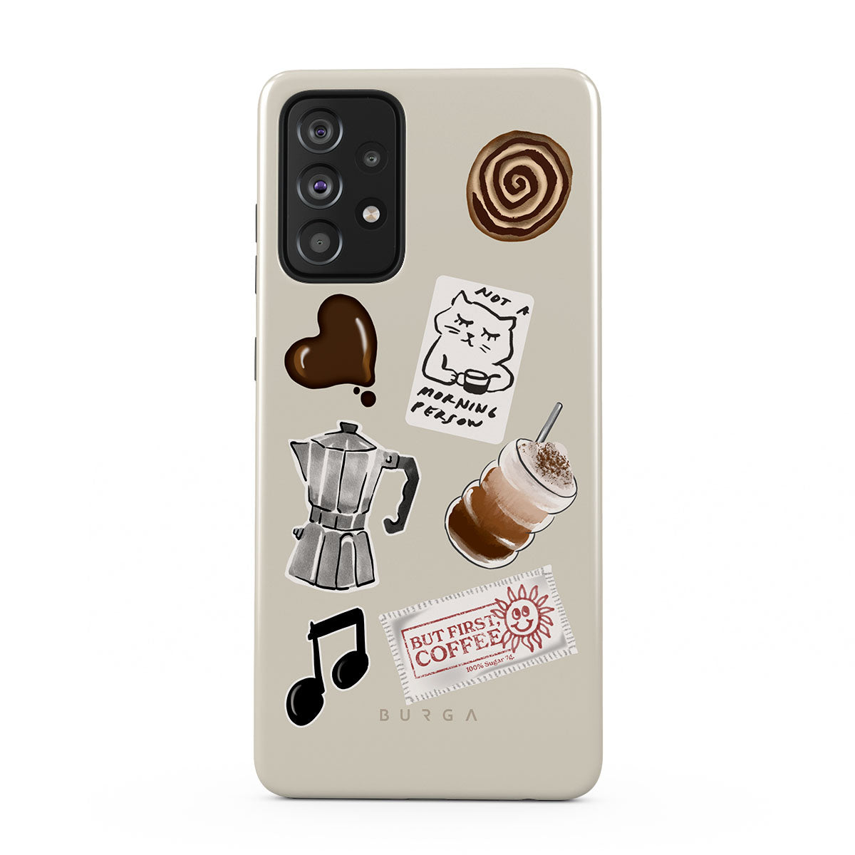 此設計特色:摩卡壺、冰沙、「不是晨型人」貼紙、「但首先,咖啡」收據、音符