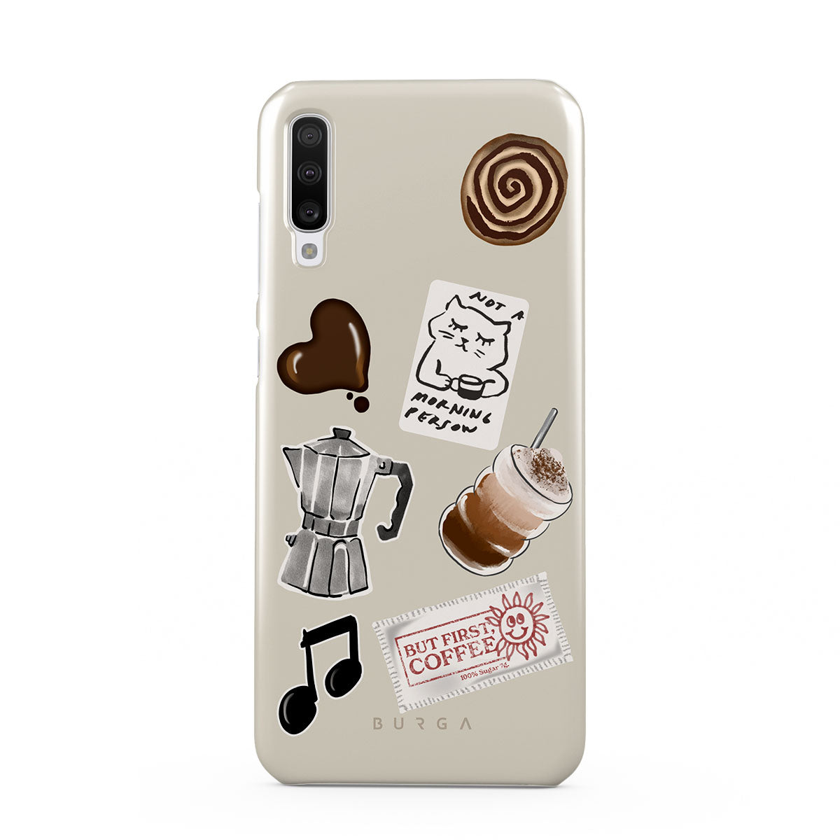 此設計特色:摩卡壺、冰沙、「不是晨型人」貼紙、「但首先,咖啡」收據、音符