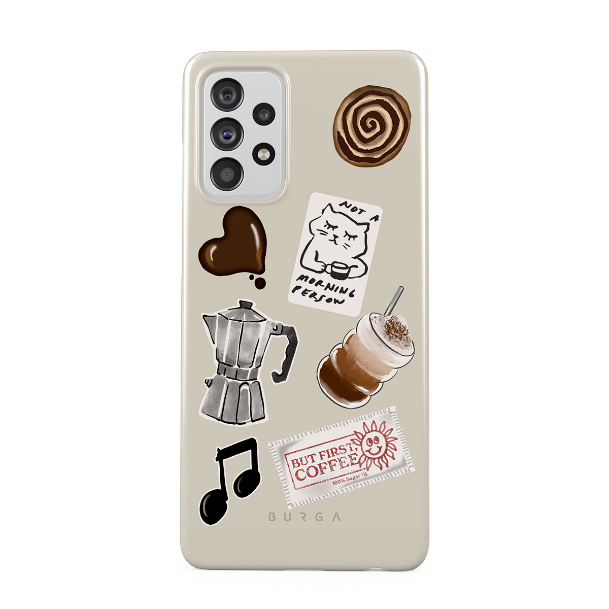 此設計特色:摩卡壺、冰沙、「不是晨型人」貼紙、「但首先,咖啡」收據、音符