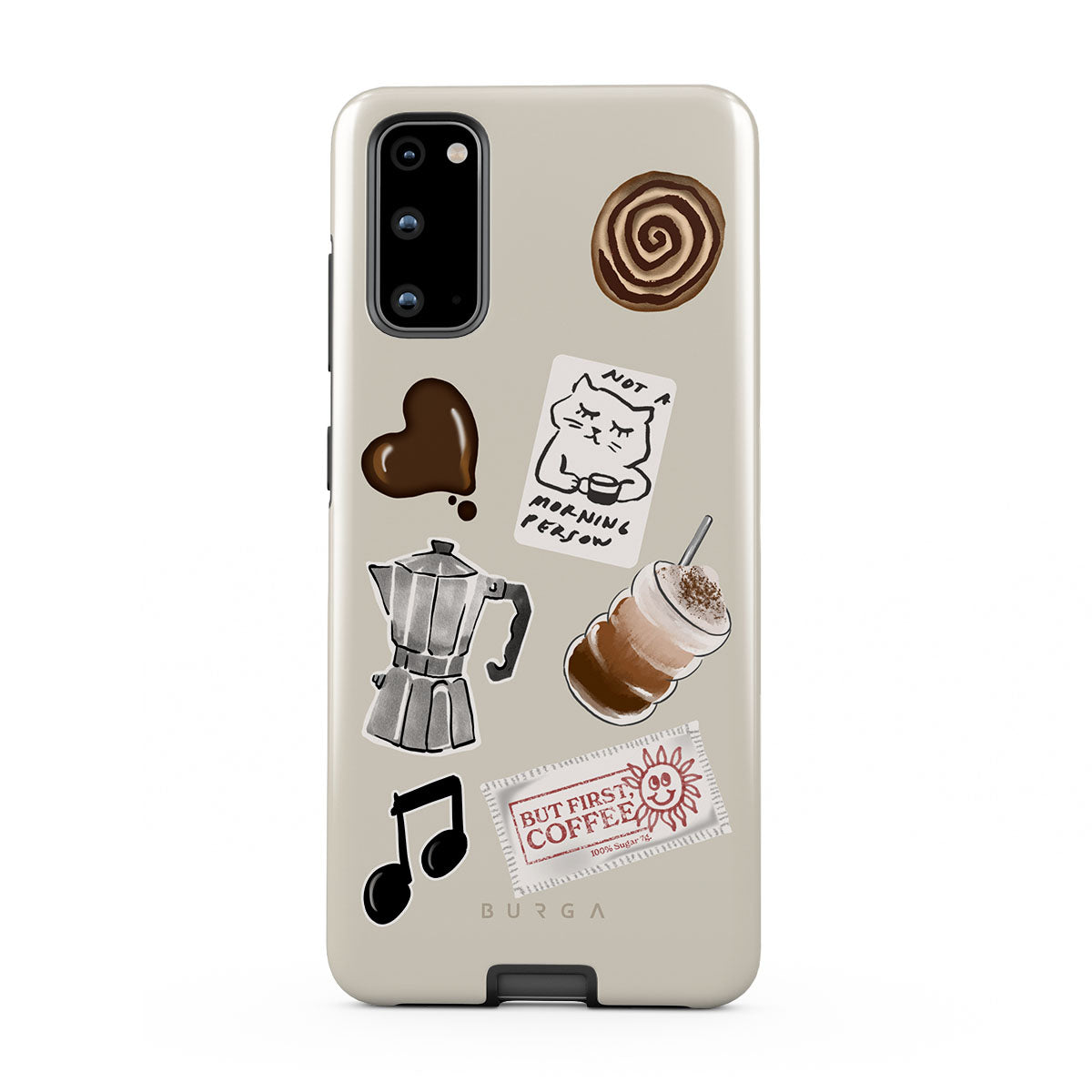 此設計特色:摩卡壺、冰沙、「不是晨型人」貼紙、「但首先,咖啡」收據、音符