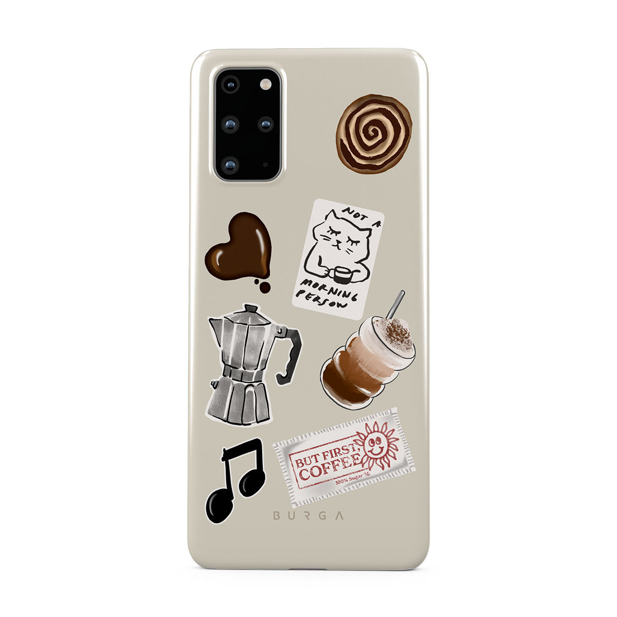 此設計特色:摩卡壺、冰沙、「不是晨型人」貼紙、「但首先,咖啡」收據、音符