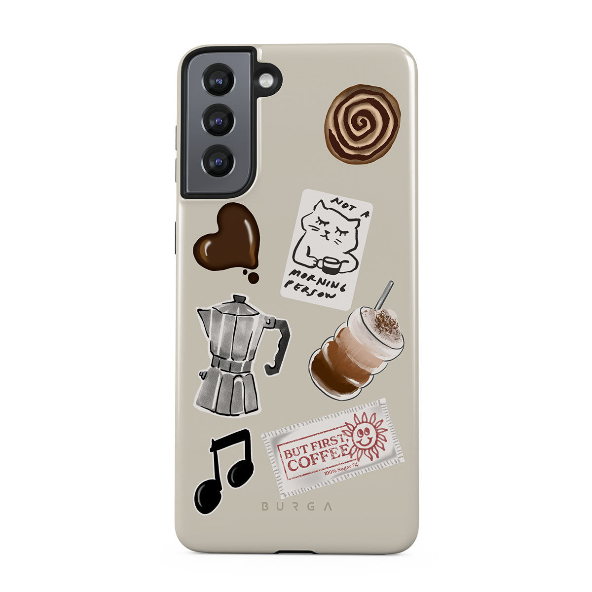 此設計特色:摩卡壺、冰沙、「不是晨型人」貼紙、「但首先,咖啡」收據、音符