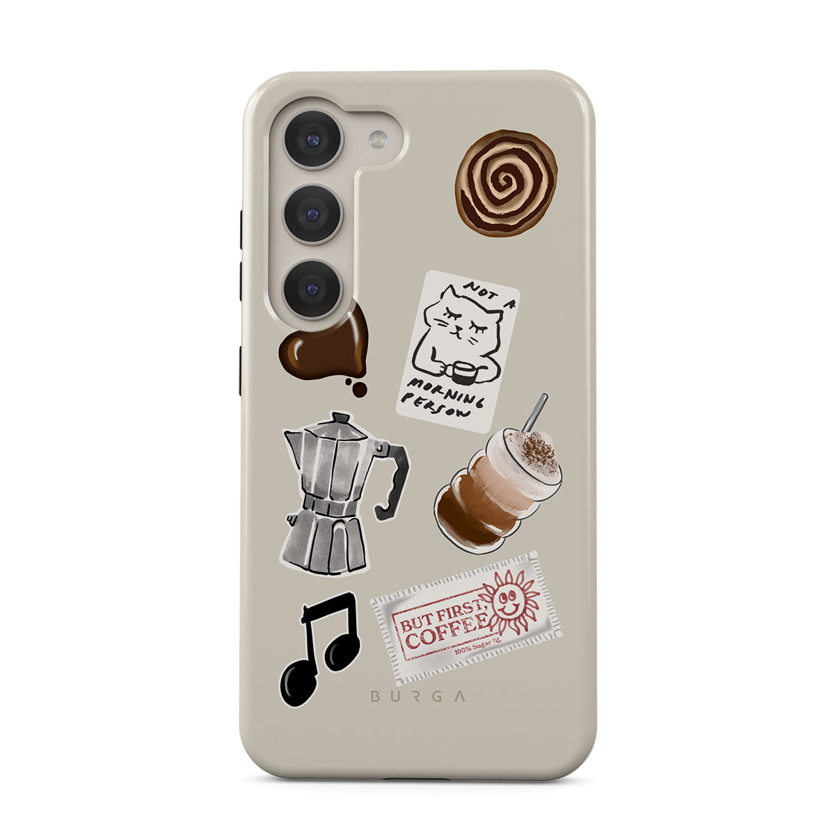 此設計特色:摩卡壺、冰沙、「不是晨型人」貼紙、「但首先,咖啡」收據、音符