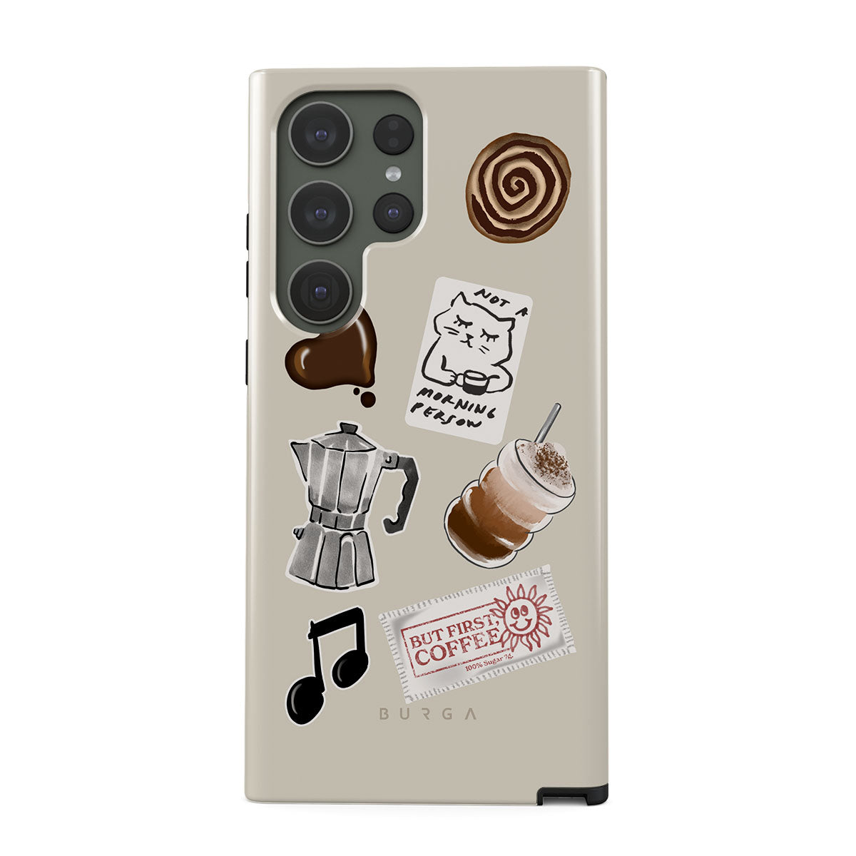 此設計特色:摩卡壺、冰沙、「不是晨型人」貼紙、「但首先,咖啡」收據、音符