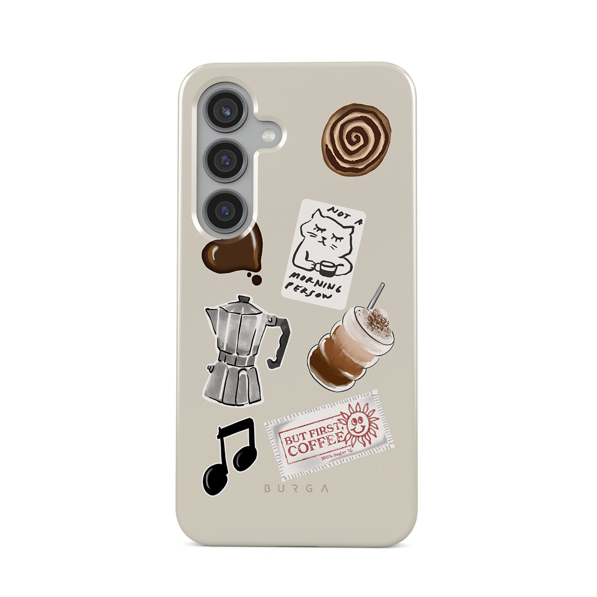 此設計特色:摩卡壺、冰沙、「不是晨型人」貼紙、「但首先,咖啡」收據、音符