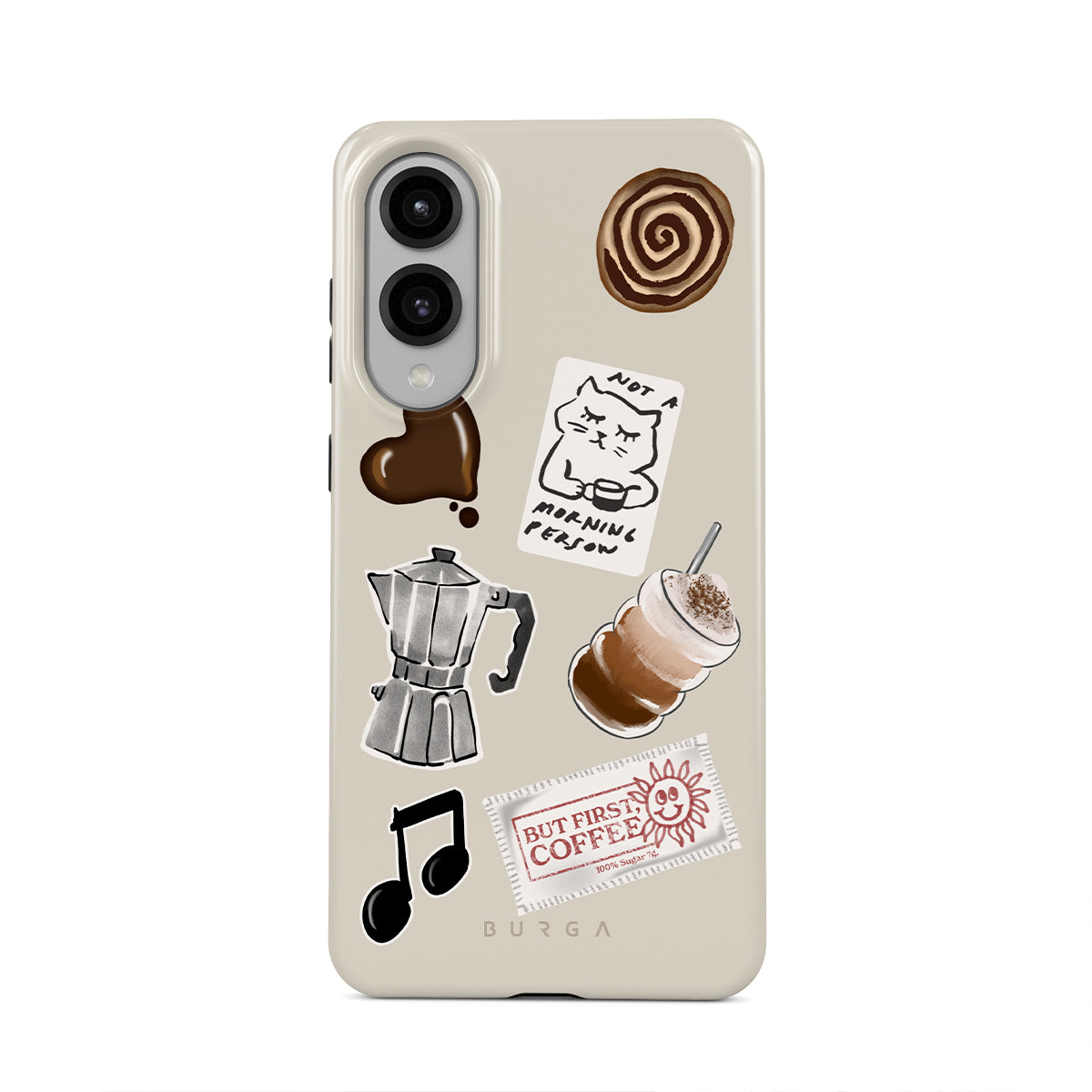 此設計特色:摩卡壺、冰沙、「不是晨型人」貼紙、「但首先,咖啡」收據、音符