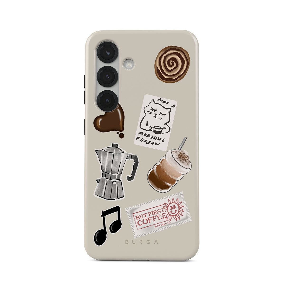 此設計特色:摩卡壺、冰沙、「不是晨型人」貼紙、「但首先,咖啡」收據、音符
