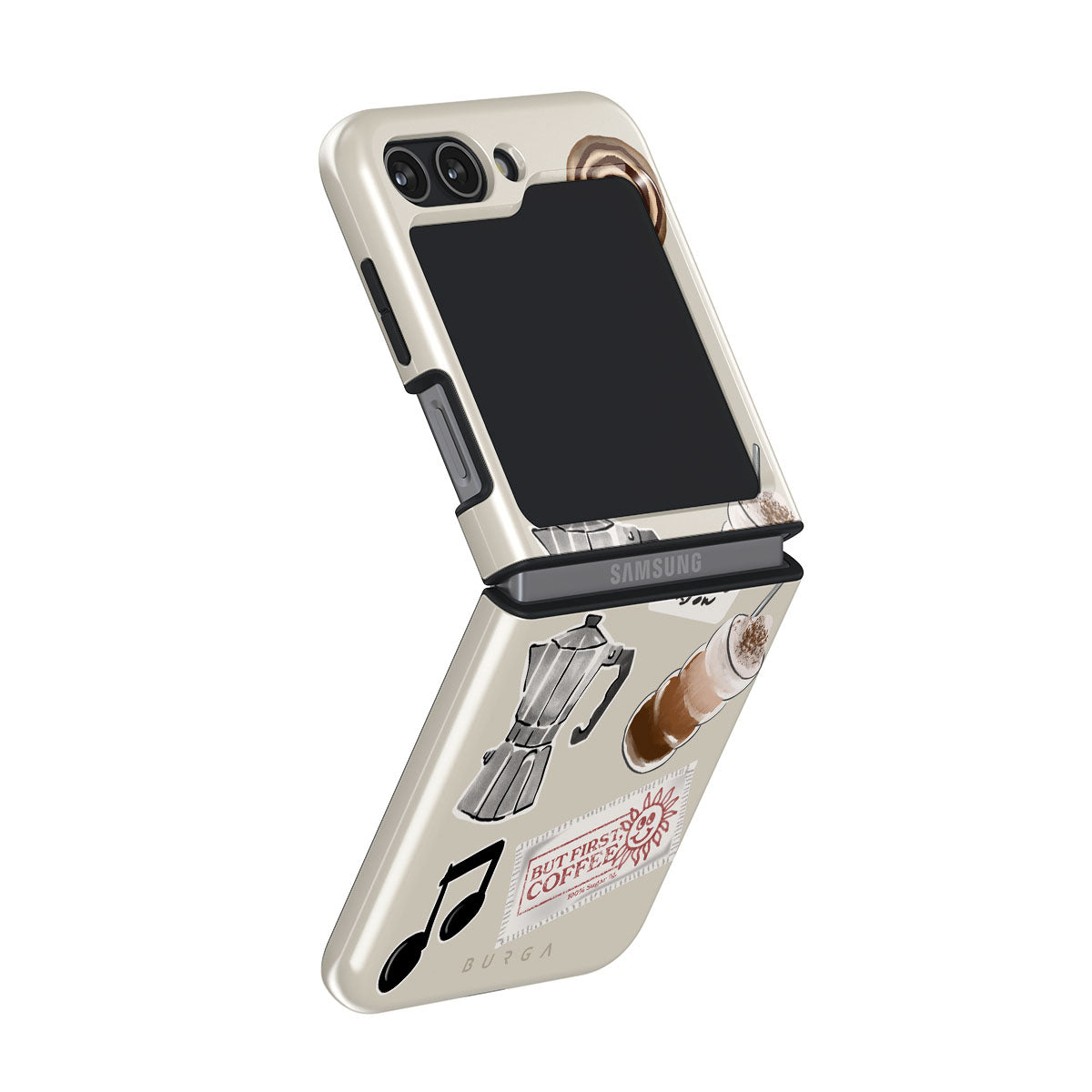 此設計特色:摩卡壺、冰沙、「不是晨型人」貼紙、「但首先,咖啡」收據、音符