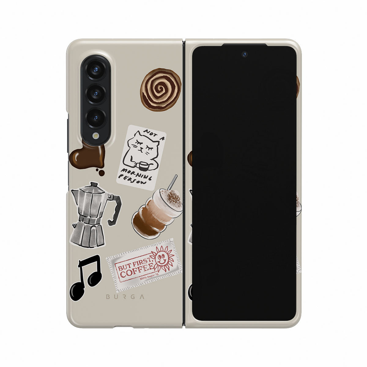 此設計特色:摩卡壺、冰沙、「不是晨型人」貼紙、「但首先,咖啡」收據、音符