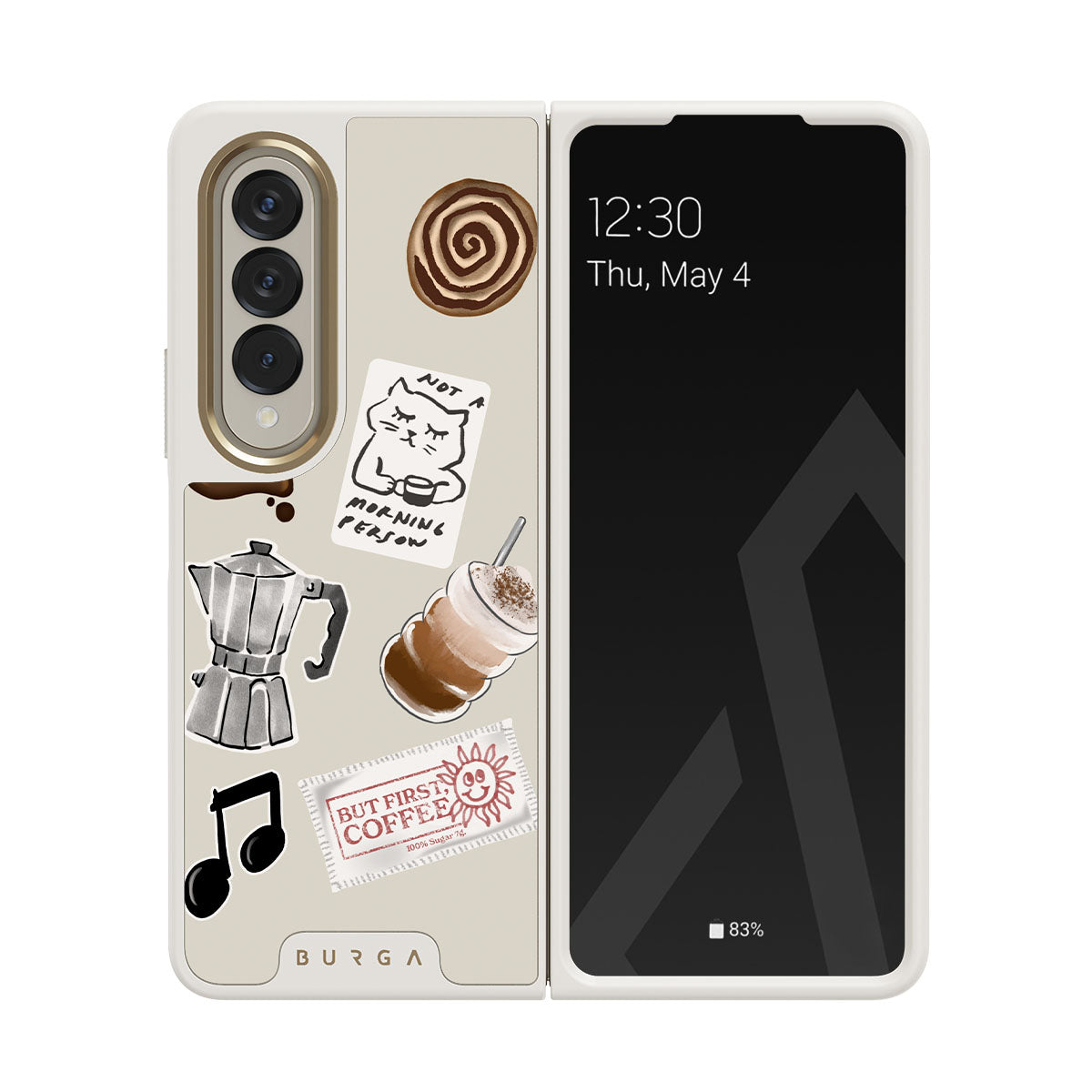 此設計特色:摩卡壺、冰沙、「不是晨型人」貼紙、「但首先,咖啡」收據、音符