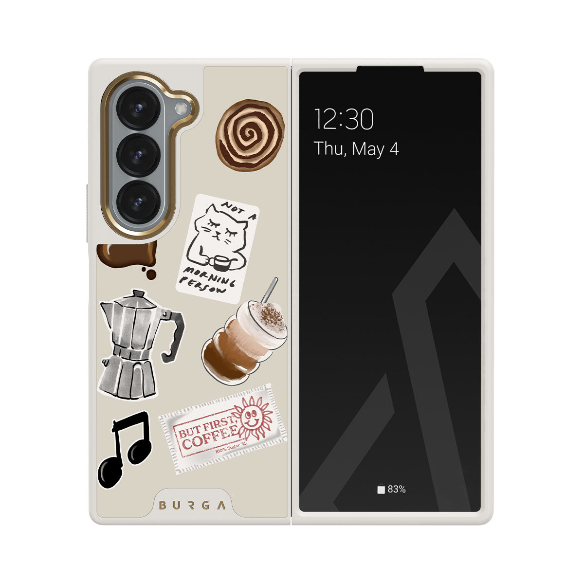 此設計特色:摩卡壺、冰沙、「不是晨型人」貼紙、「但首先,咖啡」收據、音符