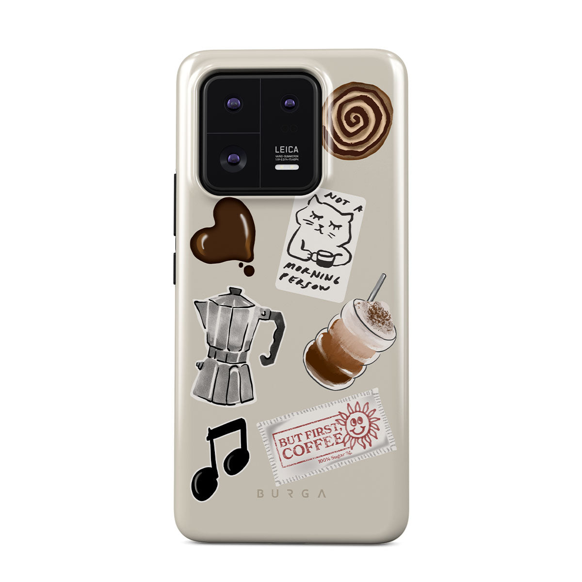 此設計特色:摩卡壺、冰沙、「不是晨型人」貼紙、「但首先,咖啡」收據、音符