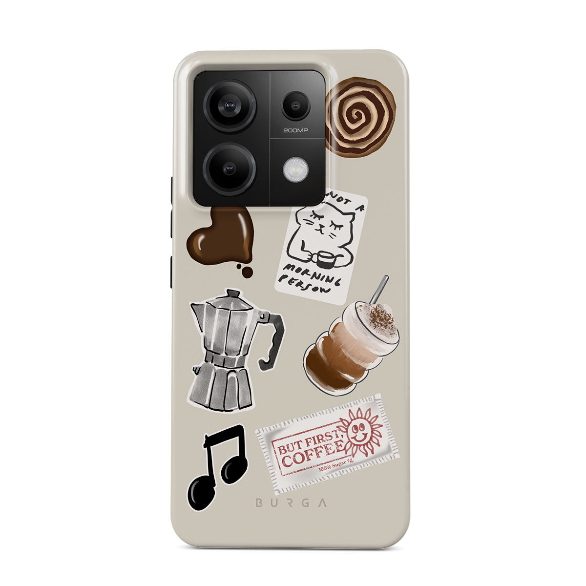 此設計特色:摩卡壺、冰沙、「不是晨型人」貼紙、「但首先,咖啡」收據、音符
