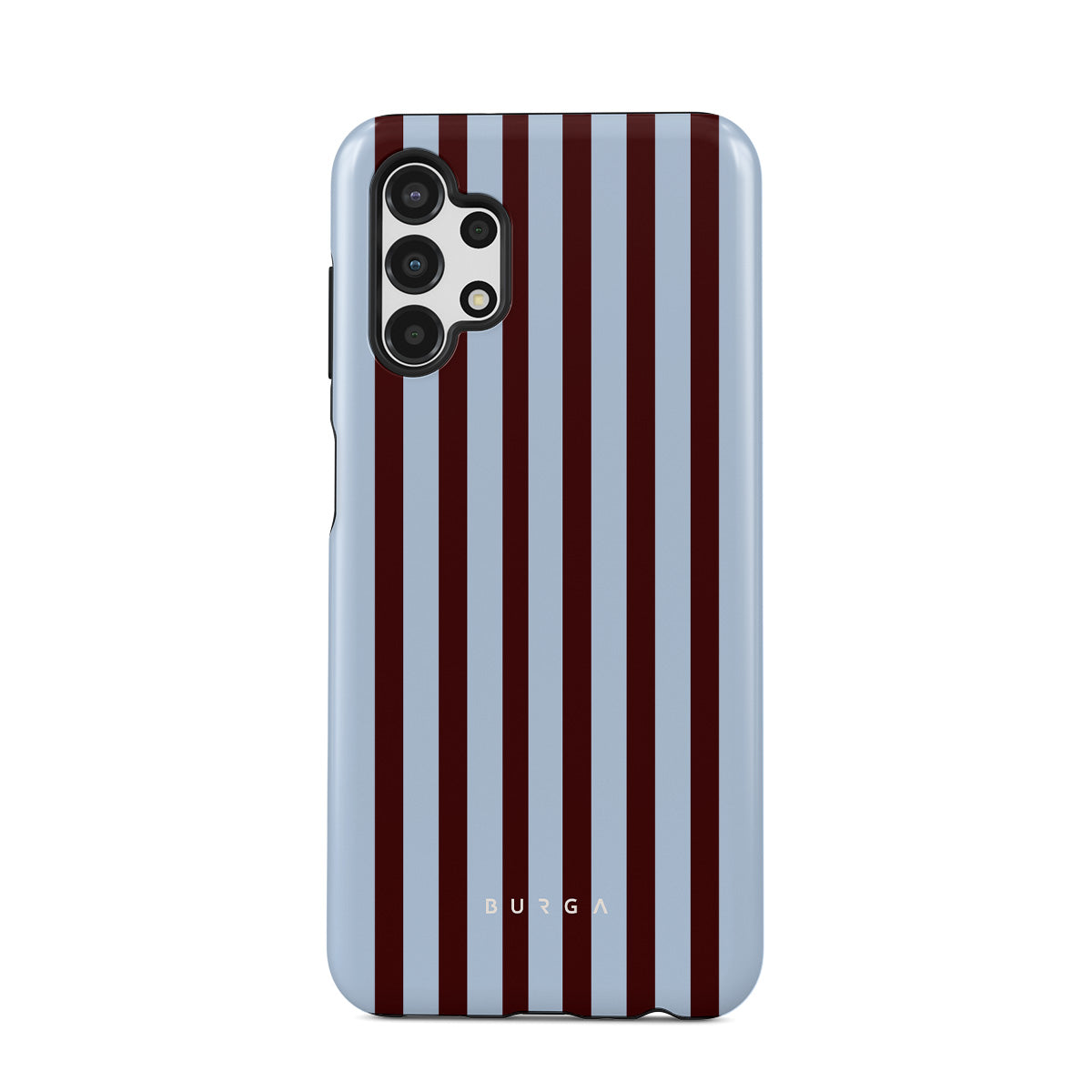 此設計特色: 棕色與嬰兒藍的直條紋。