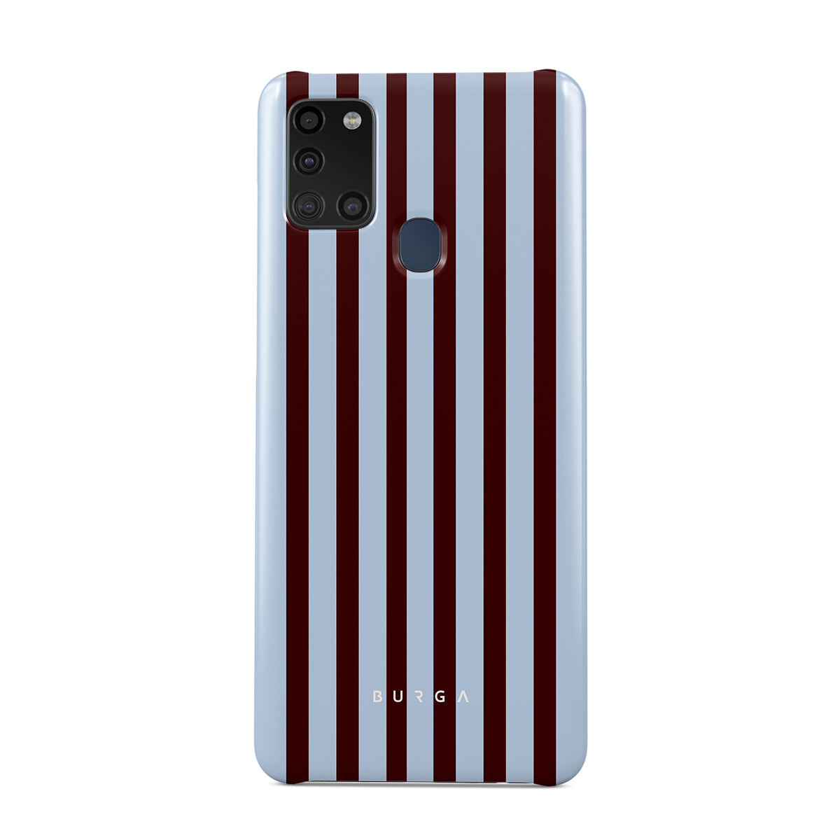 此設計特色: 棕色與嬰兒藍的直條紋。