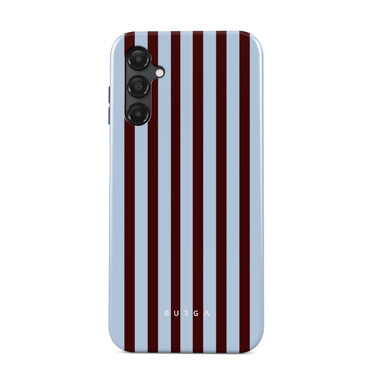 此設計特色: 棕色與嬰兒藍的直條紋。