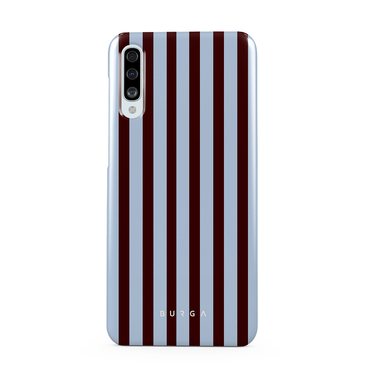 此設計特色: 棕色與嬰兒藍的直條紋。